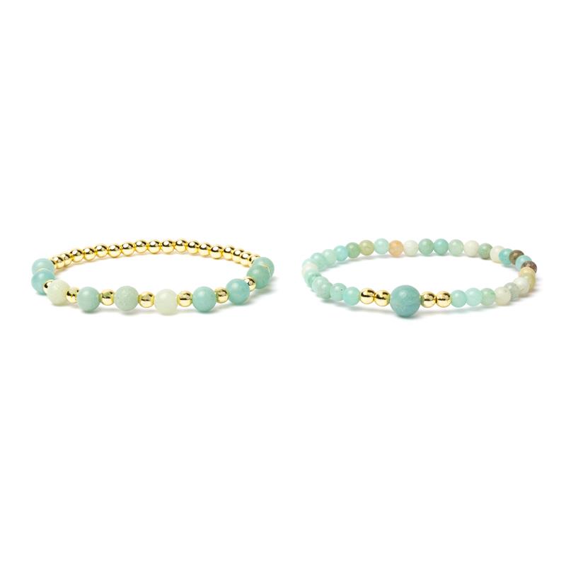 Een set van twee elastische edelsteenarmbanden van amazoniet en hematiet.