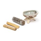 Complete smudge set met witte salie, lavendel, Palo Santo, abalone schelp en houten driepoot. Direct klaar voor gebruik.