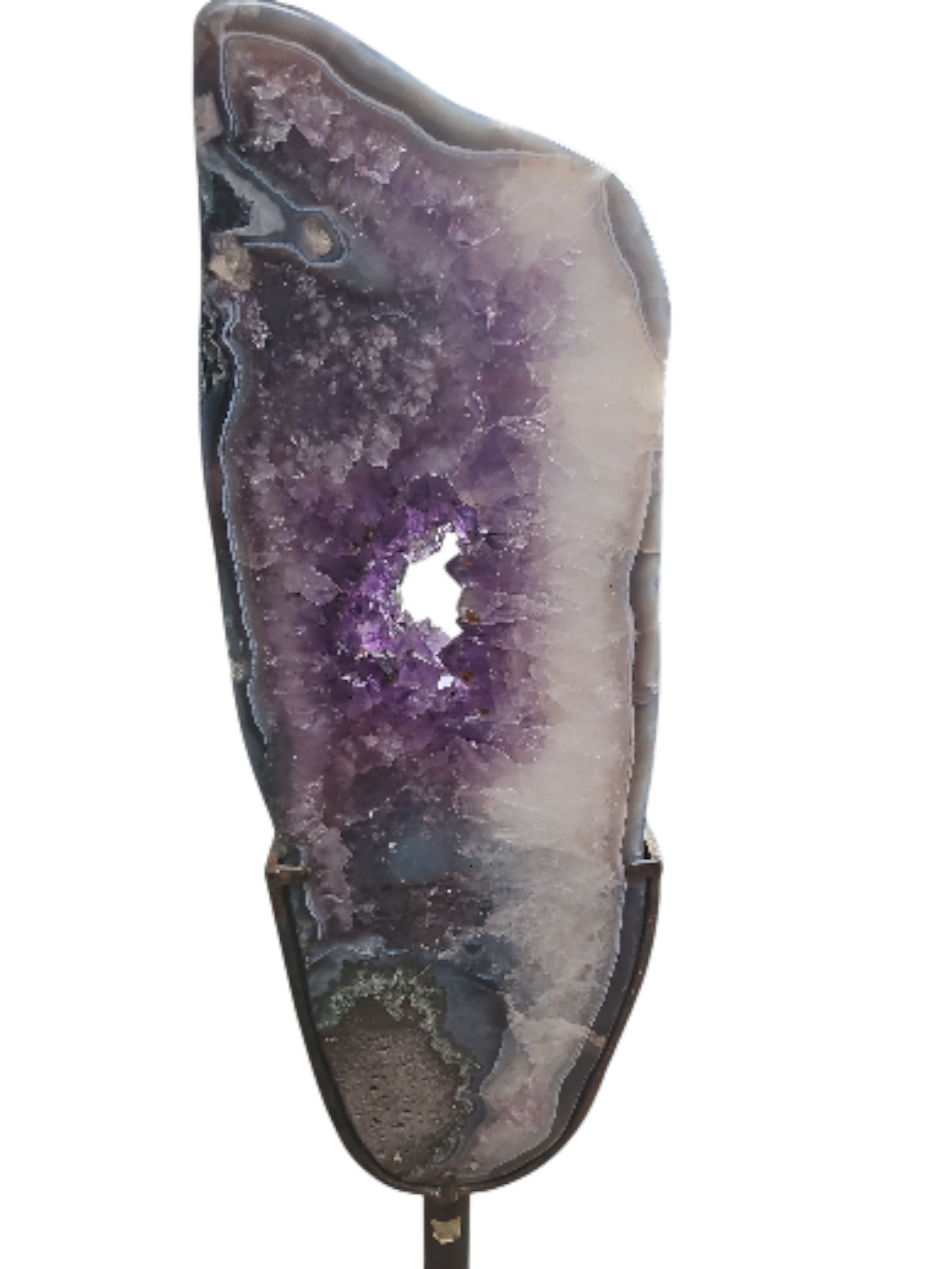 Deze Amethist  is een van de bekendste steensoorten. De diepe kleur paars spreekt tot de verbeelding maar ook haar esoterische eigenschappen zijn niet mis. Zo werkt de steen zuiverend en beschermend maar gaat het kracht arsenaal helemaal los bij de kruin en het 3e chakra. De steen helpt openen voor spirituele vaardigheden en deze te vergroten voor diegenen die ze al hebben ontdekt. Contact maken met hogere energie doe je gemakkelijk en veilig met Amethist. De krachtige paarse steen plaatst een lichtveld om haar drager (of een ruimte) heen die beschermt, voedt en heelt.